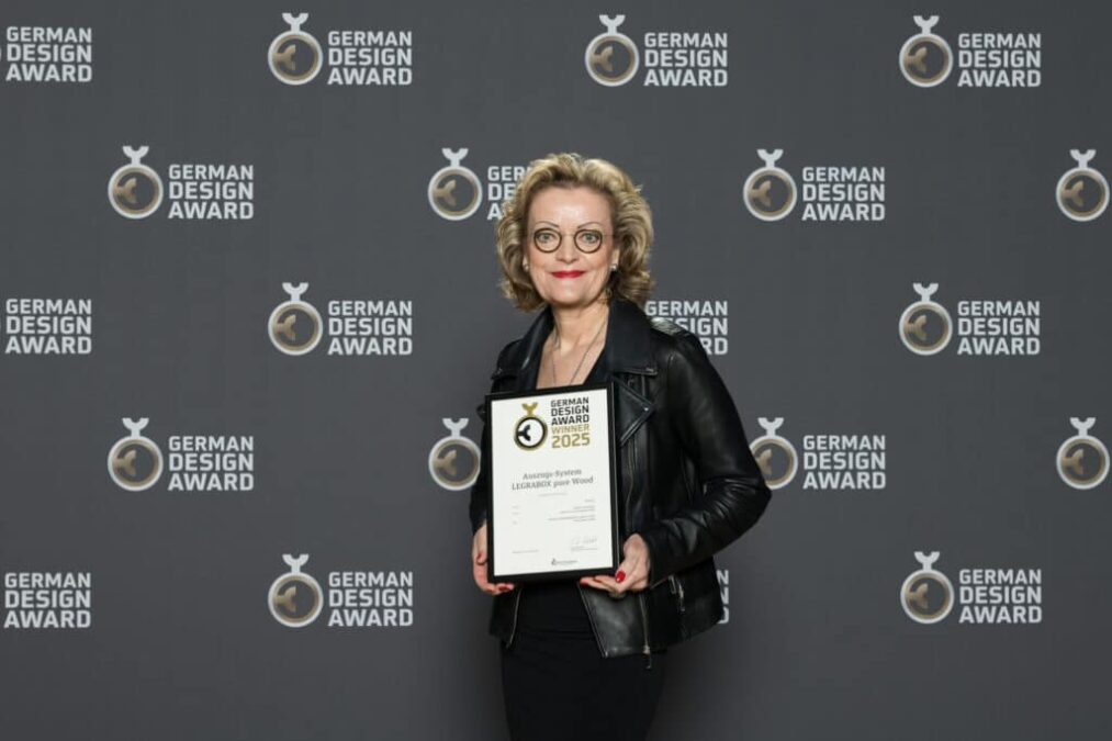 - German Design Award – WINNER 2025 : pour le Système de tiroir LEGRABOX Pure WOOD, alliant l’esthétique chaleureuse du bois au confort d’usage moderne. Le système de tiroirs LEGRABOX pure WOOD se distingue par son design épuré et intemporel, alliant la beauté naturelle du bois à la robustesse du métal. Ce système offre une stabilité exceptionnelle et une fermeture silencieuse, même dans des conditions climatiques variables.