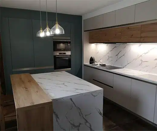 L’ensemble s’articule autour d’un ilot central à la fois fonctionnel et convivial, véritable cœur de la cuisine, qui invite aussi bien à la préparation qu’au partage. Les meubles colonnes ont été soigneusement intégrés dans la structure du mur, offrant un rendu parfaitement lisse et cohérent, tout en maximisant les rangements. Enfin, l’éclairage suspendu, composé de luminaires aux lignes épurées et aux finitions élégantes, vient rythmer visuellement l’espace sans l’alourdir, en apportant une lumière douce et chaleureuse.